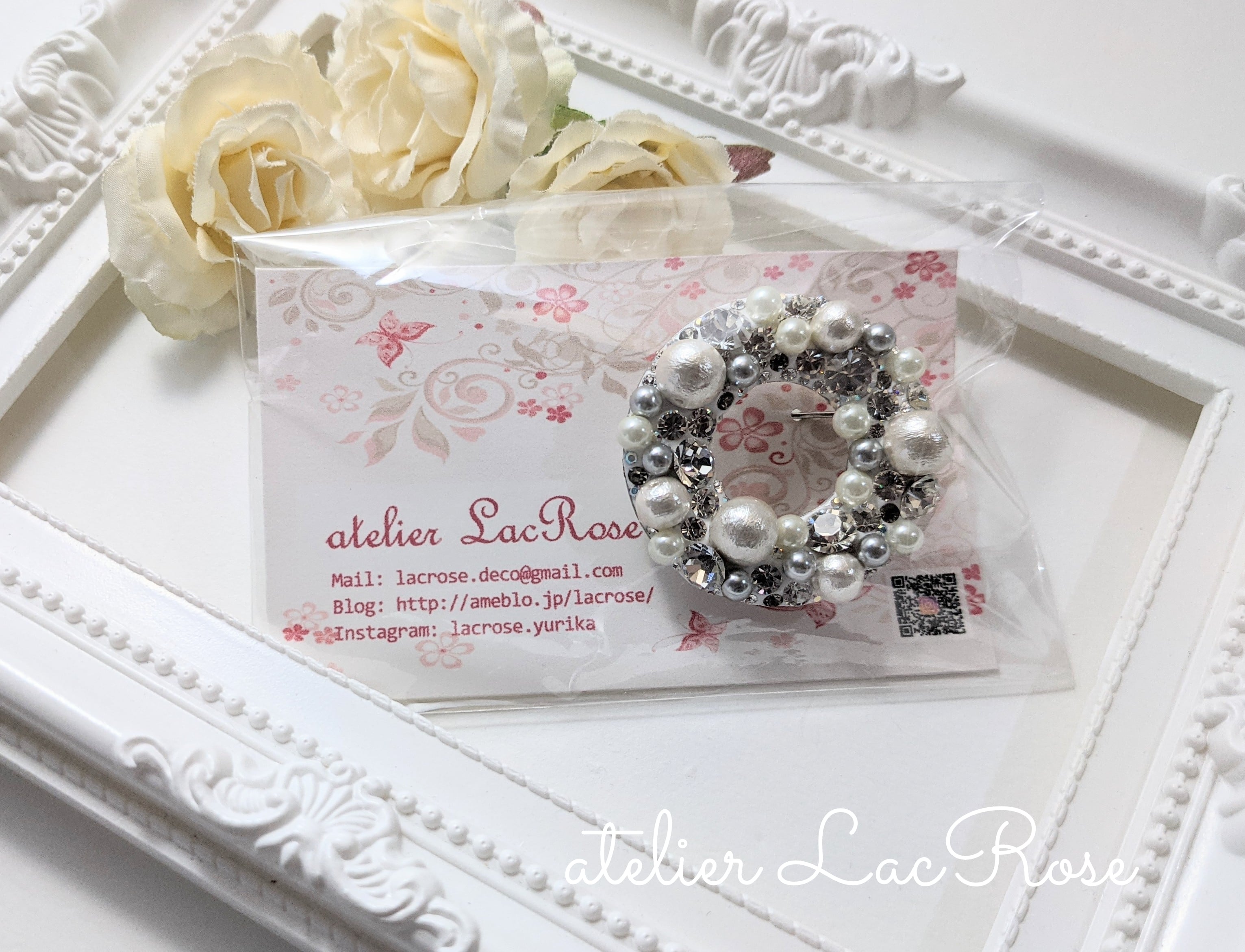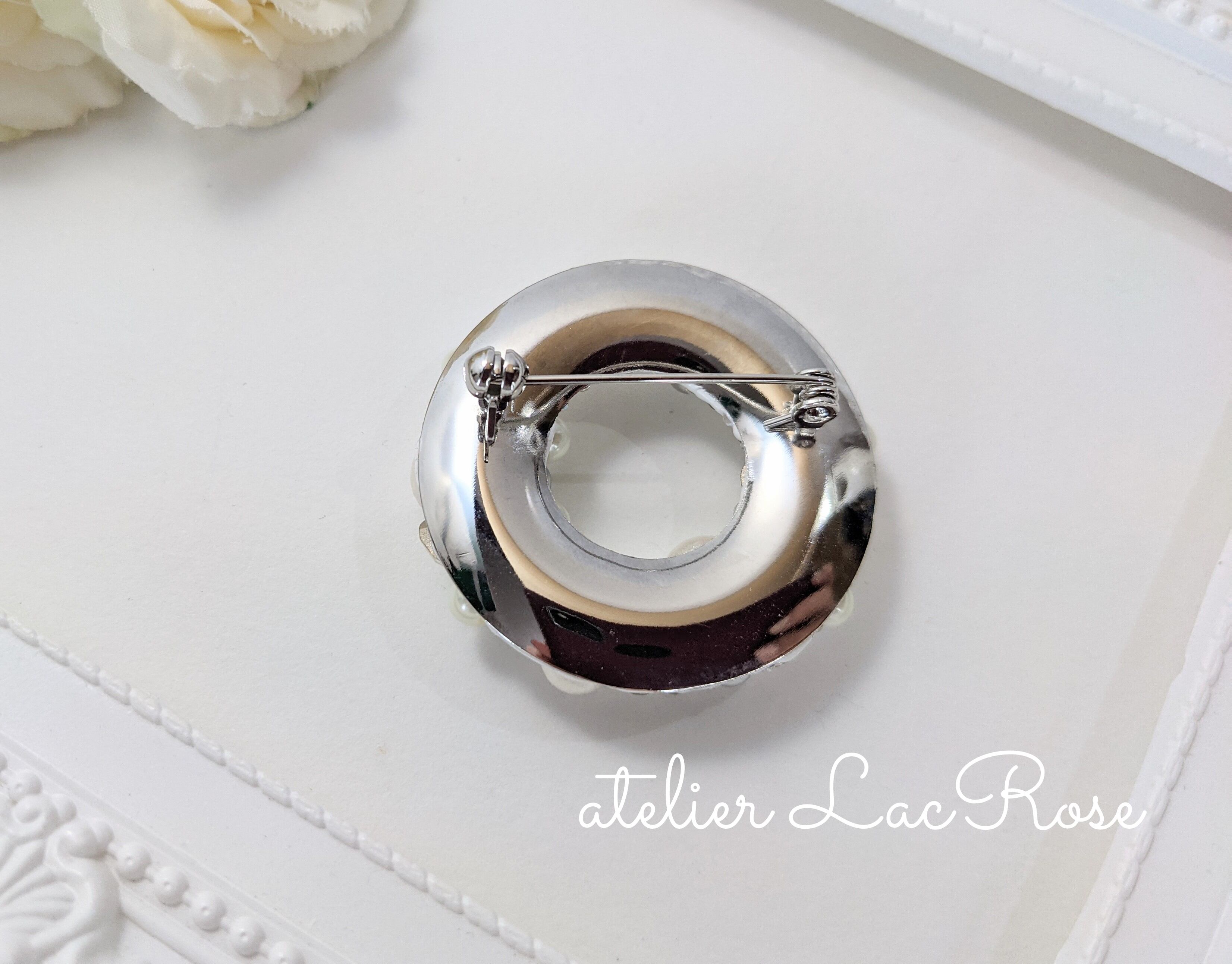 大粒のコットンパールや、大小たくさんのスワロフスキー、カラーパールも散りばめた贅沢なブローチ。