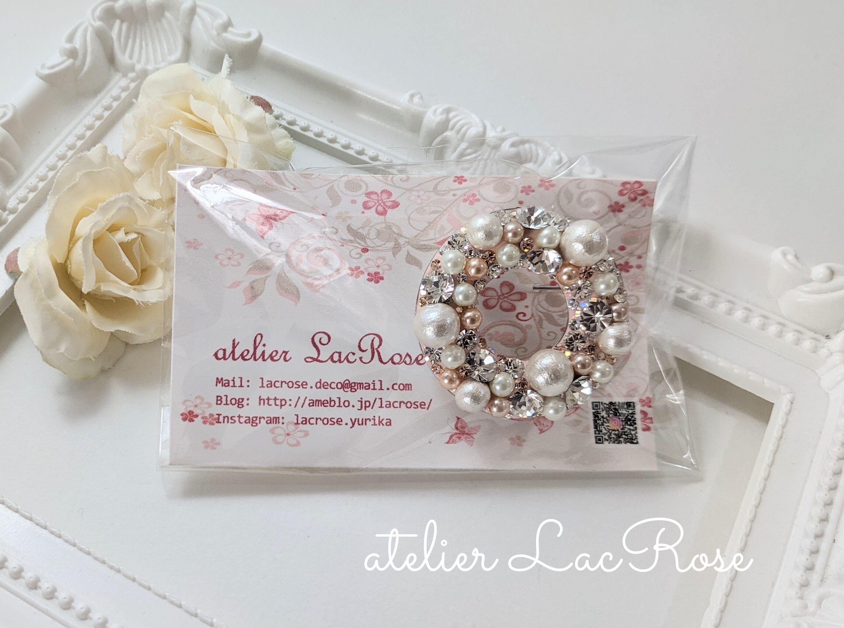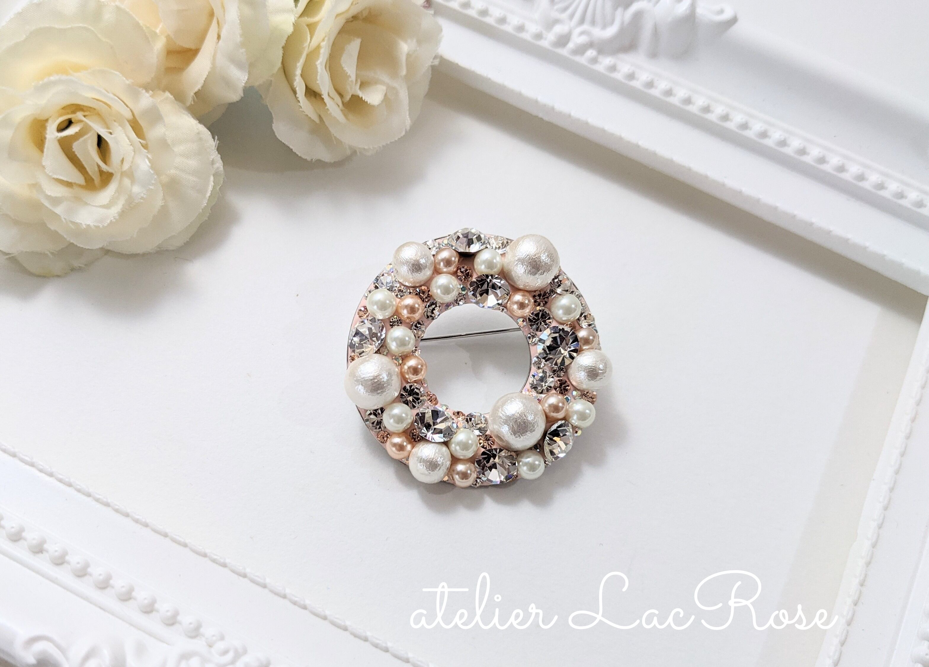 大粒のコットンパールや、大小たくさんのスワロフスキー、カラーパールも散りばめた贅沢なブローチ。