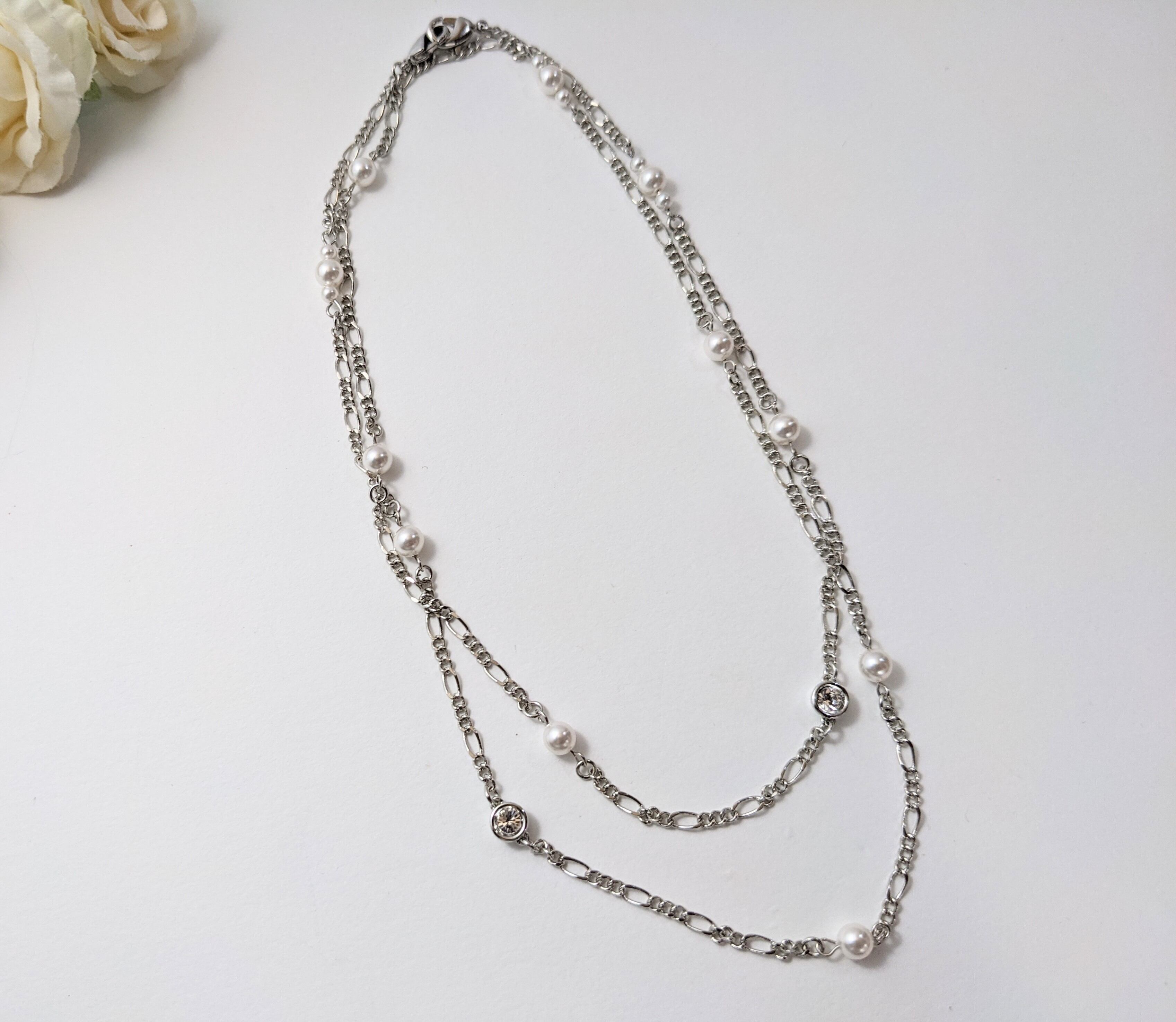スワロフスキーパールとチェーンのコンビネーションが軽やかで、カジュアルにもフォーマルにもお使いいただけます。